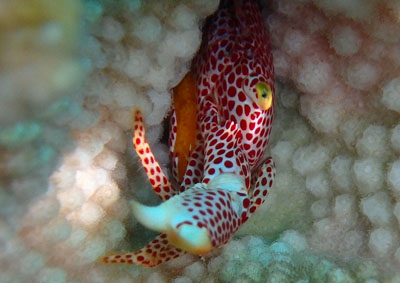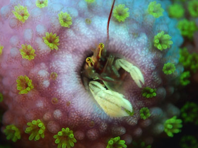 溢れんばかりのオレンジ色の卵を抱えるオオアカホシサンゴガニ♪